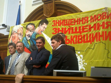 Депутаты развесили в президиуме плакат с изображением Президента Украины Виктора Януковича, премьер-министра Николая Азарова и министра образования и науки, молодежи и спорта Дмитрия Табачника и надписью "Уничтожаешь язык - уничтожаешь страну".