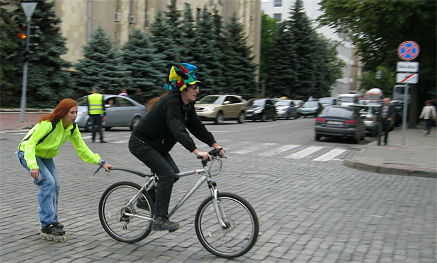 На Сумской к велосипедистам подключились роллеры и прочие буденовцы.
