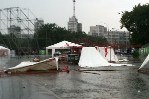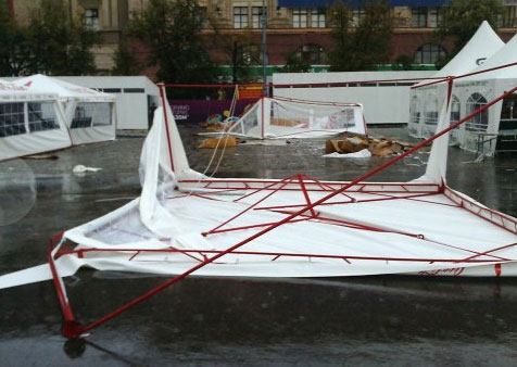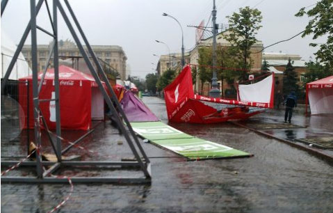 Ураган помешал строителям окончить строительство фан-зоны на пл. Свободы в Харькове. Ветер сносил палатки и повалил несколько павильонов, в которых будут продавать еду и сувениры для фанов, а также искорежил металлический забор со стороны сада Шевченко.