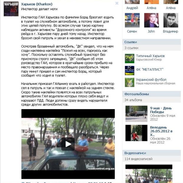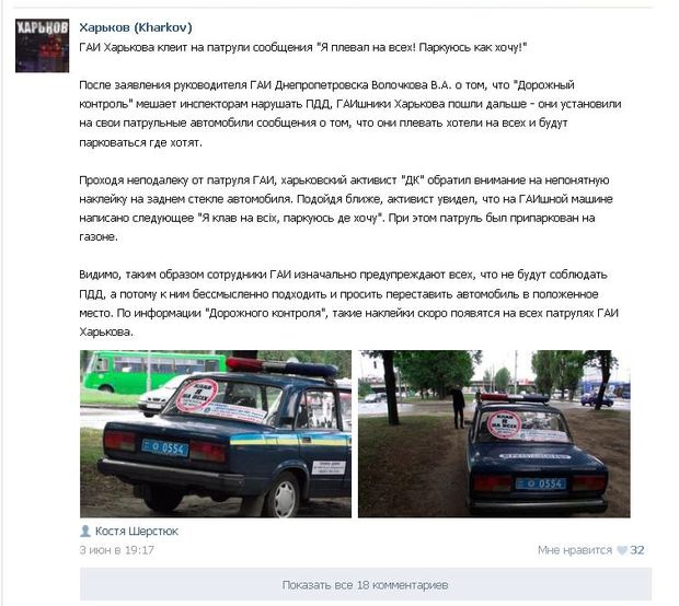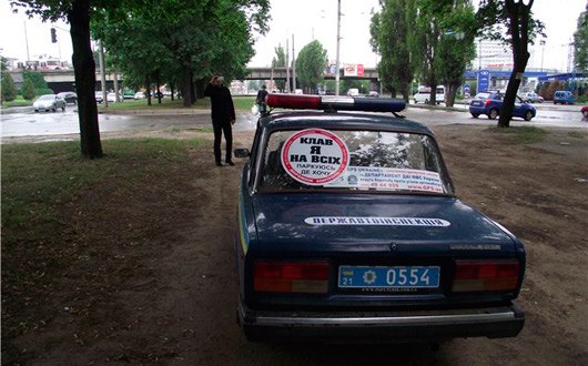 Текст гласит: "После заявления руководителя ГАИ Днепропетровска Волочкова В.А. о том, что "Дорожный контроль" мешает инспекторам нарушать ПДД, ГАИшники Харькова пошли дальше - они установили на свои патрульные автомобили сообщения о том, что они плевать хотели на всех и будут парковаться где хотят.