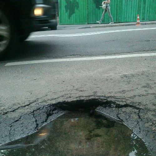 В первые же дни Евро-2012 в центре Киева в очередной раз провалился асфальт. Новая яма образовалась на улице Гончара. Об этом в своем Facebook написал киевлянин Богдан Кутепов, сообщает "Украинская правда".