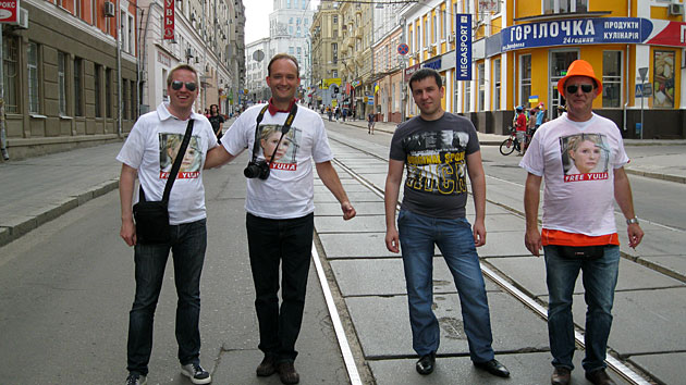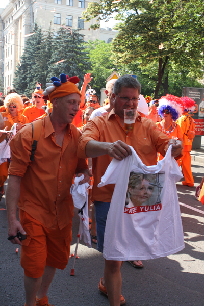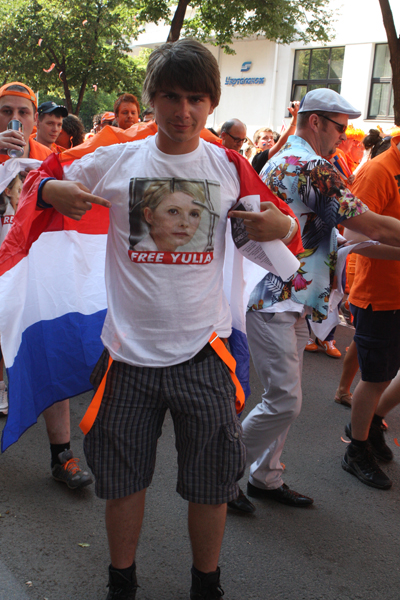 Напомним, в субботу, 9 июня 2012 года в Харькове многие голландские фанаты во время шествия через весь город на стадион "Металлист" одевали футболки «Юле – волю!».