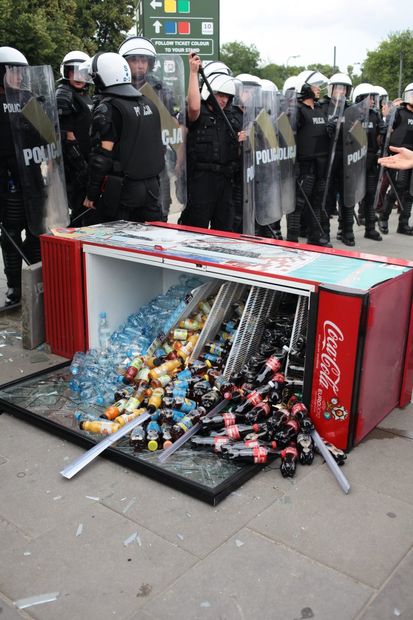 Как сообщает Украинская правда, польские болельщики непосредственно у Национального стадиона стали закидывать полицейских файерами и стеклянными бутылками, и в итоге местная полиция была вынуждена открыть шумовые предупредительные выстрелы в воздух.