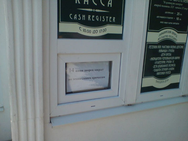 На закрытых дверях дворца висит табличка: "14 июня дворец закрыт по техническим причинам". При этом за забором можно рассмотреть осветительные приборы. Вокруг все завешано белыми занавесками, а непосредственно на дверях стоит вышибала, который держит оборону перед любопытными туристами и журналистами.