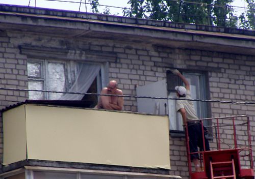 Рабочие, с помощью десятка единиц спецтехники, залатываются ямы на асфальте; вскопана клумба (особое усердие проявила женщина в деловом костюме), высаживаются цветы, рабочие на 4-х автовышках красят рамы окон квартир белой, балконы – желтой, придорожные столбы – серой краской.