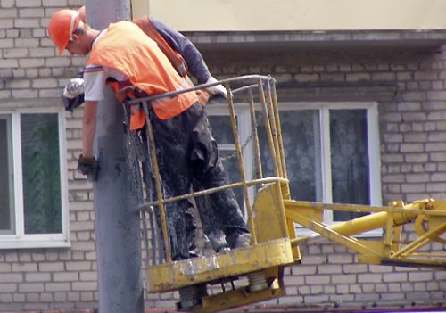 С автовышек красят балконы, окна и столбы «хрущевки» по пр. Правды, 12