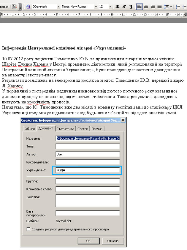 В свойствах документа "доктора" забыли затереть учреждение, в стенах которого был приготовлен "диагноз Тимошенко" – ХОДА или Харківська обласна державна адміністрація.