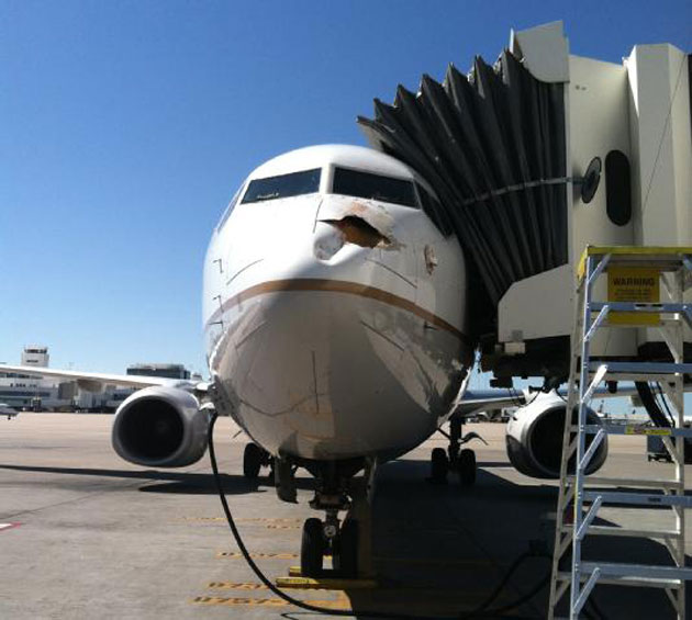 В Международном аэропорту Денвера во вторник утром в приземлявшийся Boeing 737 авиакомпании United Airlines влетела птица, оставив в носовой части самолета огромную дыру.