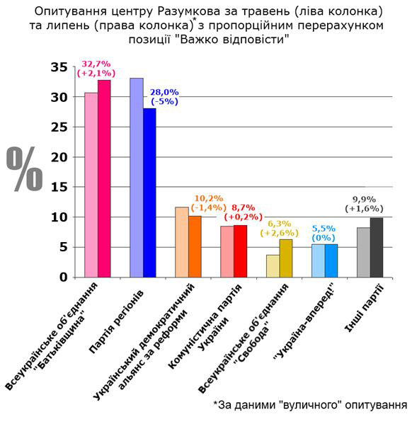 Для удобства и приближение показателей к избирательным, процент тех, кто выбрал пункт "затрудняюсь ответить", распределены пропорционально между теми партиями, которые преодолевают 5% барьер, а таких сейчас есть шесть: ВО "Батькивщина", Партия регионов, УДАР, коммунисты, ВО "Свобода" и - на грани прохождения - новейший политпроект "Украина - Вперед!"