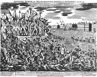 В 1819 году в Англии произошло событие, получившее название "Манчестерская бойня", столкновение гражданских лиц и оратора Гента с полицией и гусарами после митинга, на котором были выдвинуты требования предоставления всеобщего избирательного права. В результате столкновений по разным оценкам погибло от 11до 15 человек и ранено от 400 до 700 человек.