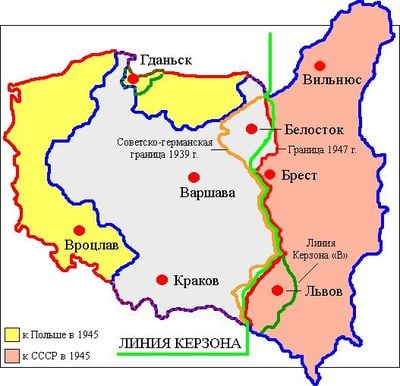 В 1945 году в Москве между СССР и Польшей подписан договор о советско-польской границе, в основу которой была положена «линия Керзона», которая была рекомендована 8 декабря 1919 Верховным советом Антанты в качестве восточной границы Польши и установлена в ноте лорда Кёрзона. Линия соответствует этнографическому принципу: к западу от неё находились земли с преобладанием польского населения, к востоку — территории с преобладанием литовского, белорусского и украинского населения. На Тегеранской конференции (ноябрь–декабрь 1943 года) было принято предложение Черчиля о том, что в качестве границы послевоенной Польши на востоке должна быть линия Кёрзона. 11 января 1944 Советское правительство заявило о готовности положить в основу послевоенной советско-польской границы «линию Керзона». На Крымской конференции 1945 одним из пунктов был разрешён вопрос о Польше и её границах - был установлен и закреплён вариант Черчилля.