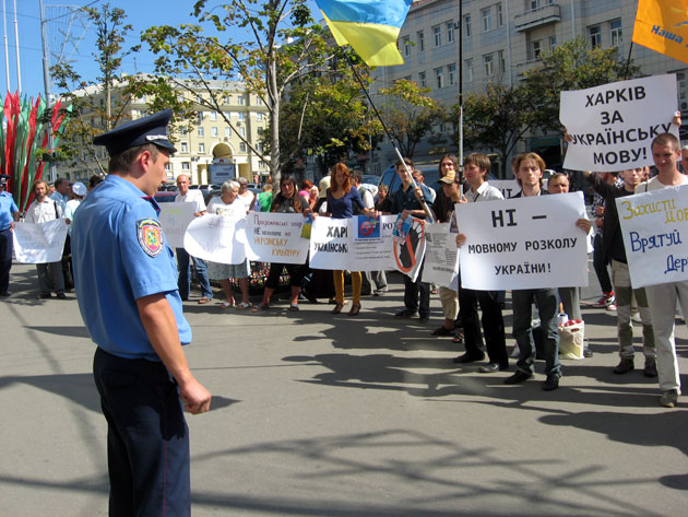 Перед зданием Харьковского горсовета проходит пикет противников закона Украины "Об основах государственной языковой политики", приуроченный внеочередной сессии, на которую вынесен вопрос о реализации положений "языкового закона" в Харькове.