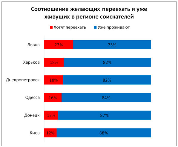 Каждый регион по-своему важен для соискателей, очевидно, что в абсолютном измерении лидирует Киев, именно сюда стремится самое большое количество тех, кто готов переехать. С другой стороны в относительном, процентном измерении лидером является Львов. В столицу Западной Украины стремится переехать самое большое количество соискателей по сравнению с тем, сколько людей уже проживает в Львове и ищет здесь работу.