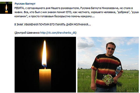 «РЕБЯТА, с сегодняшнего дня Нашего руководителя, Руслана Багмута Николаевича, не стало в живых. Все, кто был с ним знаком помнят ЕГО, как честного, хорошего человека, «добряка», «душа компании», и просто готовым бескорыстно помочь каждому...», - написал Шевченко. Координатор гражданской кампании «Форум спасения Киева» Виталий Черняховский, комментируя данное сообщение, написал, что Руслана Багмута неизвестные выбросили с 16 этажа жилого дома вчера в 11:30.