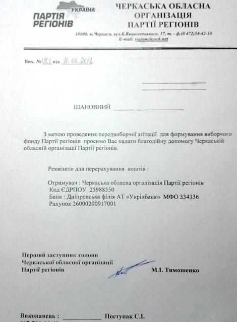 "С целью проведения предвыборной агитации для формирования избирательного фонда Партии регионов просим Вас оказать благотворительную помощь Черкасской областной организации Партии регионов", - говорится в обращении с подписью первого заместителя организации Николая Тимошенко.