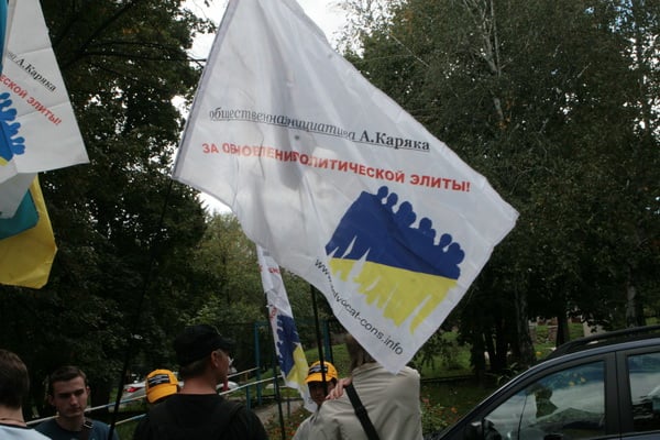 В то время, которое было анонсировано, как время проведения брифинга Власенко, под стенами больницы собрались молодые люди с флагами и в бейсболках «Общественная инициатива А.Каряка».
