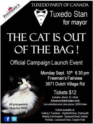В канадском Галифаксе хозяин кота по кличке Стэн в смокинге (Tuxedo Stan) выдвинул своего питомца в кандидаты в мэры города, сообщает Metro. Несмотря на то, что местные законы запрещают животным участвовать в выборах в каком-либо качестве, популярность черно-белого кота растет день ото дня. 19 сентября группа поддержки кота даже пришла послушать дебаты кандидатов в мэры, пишет Лента.ру.