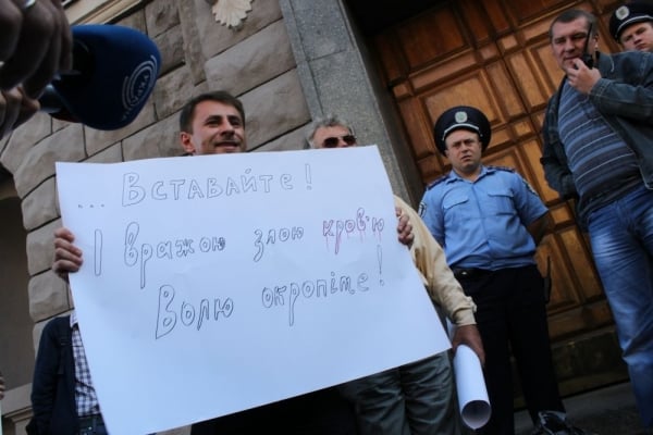 При этом, участники акции держали в руках плакаты, на одном из которых была написана цитата из произведения Тараса Шевченко "... Вставайте! И вражьей злой кровью Волю окропите! ". Слово "кровью" было подкрашено красным цветом.