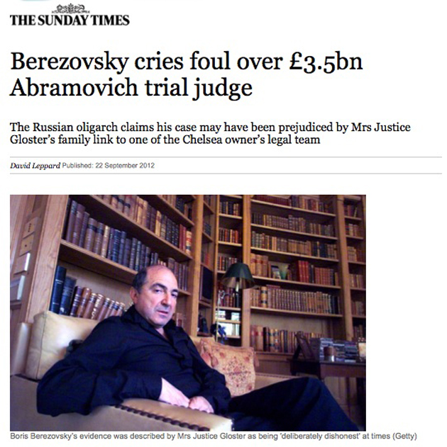 Сегодняшняя Sunday Times сообщает что леди Элизабет Глостер - судья, вынесшая в прошлом месяце решение против Бориса Березовского, уличена в конфликте интересов в пользу Романа Абрамовича.
