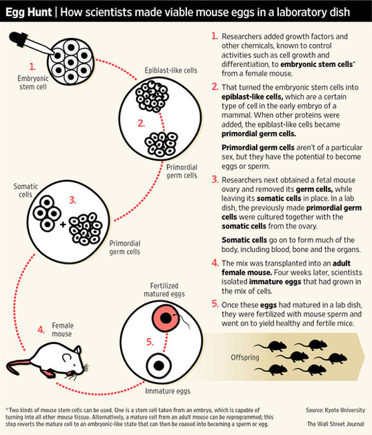 Так, биологам удалось из стволовых клеток мышек сделать «болванки» для яйцеклеток. После чего эти самые заготовки имплантировали в яичники мамы-мышки. Затем все это дело достали, оплодотворили в пробирке и снова подсадили мышке.