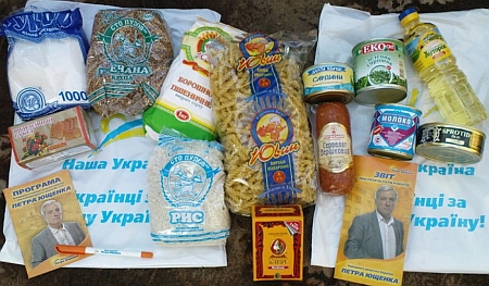 Кандидат в депутаты Петр Ющенко раздавал продовольственные пайки с колбасой, гречкой и шпротами в избирательном округе № 161, сообщает Телеканал 24.