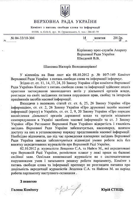 При этом, Председатель парламентского Комитета по вопросам свободы слова и информации Юрий Стець изначально заявил, что считает нонсенсом обращение Аппарата Верховной Рады Украины к комитету по указанному вопросу.