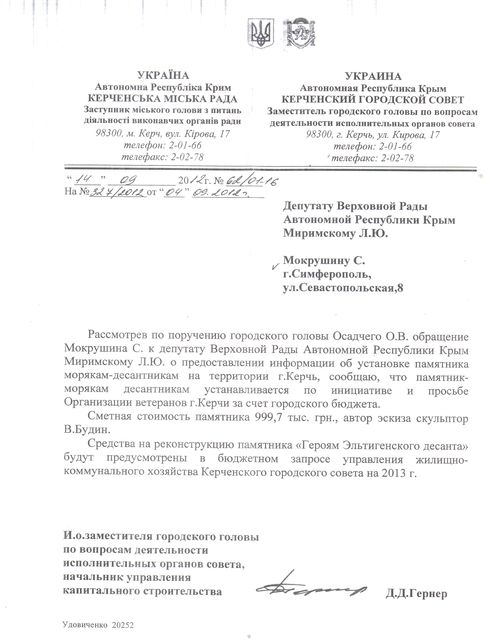 Городская власть Керчи отреагировала на скандал по-своему, сообщает Обком. На сайте городского совета и в муниципальной газете «Керченский рабочий» появилась заметка начальника Департамента по связям с общественностью Ольги Архипенко, которая называется «Когда совесть наизнанку». В ней читатели сайта Kerch.fm, осудившие бездарное творческое исполнение памятника, названы «циничными трусами» и «недалекими людьми».