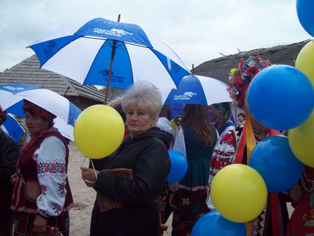 На территории комплекса «Запорожская Сечь» народные мастера представляли изделия декоративно-прикладного искусства. Что примечательно, торговля сувенирной продукцией совершалась в палатках с изображением символики Партии регионов.