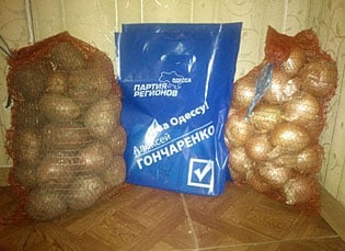 Как известно, продуктовые наборы – "фишка" агитационной кампании ПР. В частности, как сообщалось, харьковские "регионалы" одаривали своих избирателей стандартным продуктовым набором: гречка, сахар, чай, подсолнечное масло, конфеты "Коровка".