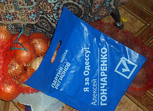 "Ровно в 8.30 (это в воскресенье!) раздался звонок в дверь и группа молодых людей (маман нашла их очень красивыми:-), выдали старушке подарок от Лёши Гончаренко (кандидата в депутаты по её округу) - пакет картошки и лука!:-)) Маман в полном восторге!:-))", - рассказывают одесситы в Facebook.