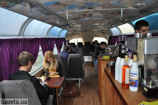 "Я этот автобус нашел на металлоломе, он уже никуда не годился. Решил его отреставрировать и дать ему новую жизнь, - говорит владелец автобуса Вадим Навроцкий. - Переварил его, поставил такой же двигатель, как тут и стоял - от ЗИЛа-124. Автобус очень интересно сделан - вся облицовка выполнена из дюралюминиевых листов, они приварены точечной сваркой к трубчатому каркасу автобуса. Мы восстановили эти листы, покрасили автобус в стиле 1960-х. Полностью реставрировать ЛАЗ и держать где-то в гараже нет смысла. Перевозить людей этим 50-летним автобусом вряд ли позволят. Решил его сделать переездной кофейней. Это уже второй мой кафе-автобус. Один ЛАЗ уже работает возле метро Шулявка. Но он сам не ездит, для передвижения нанимаем тягач".