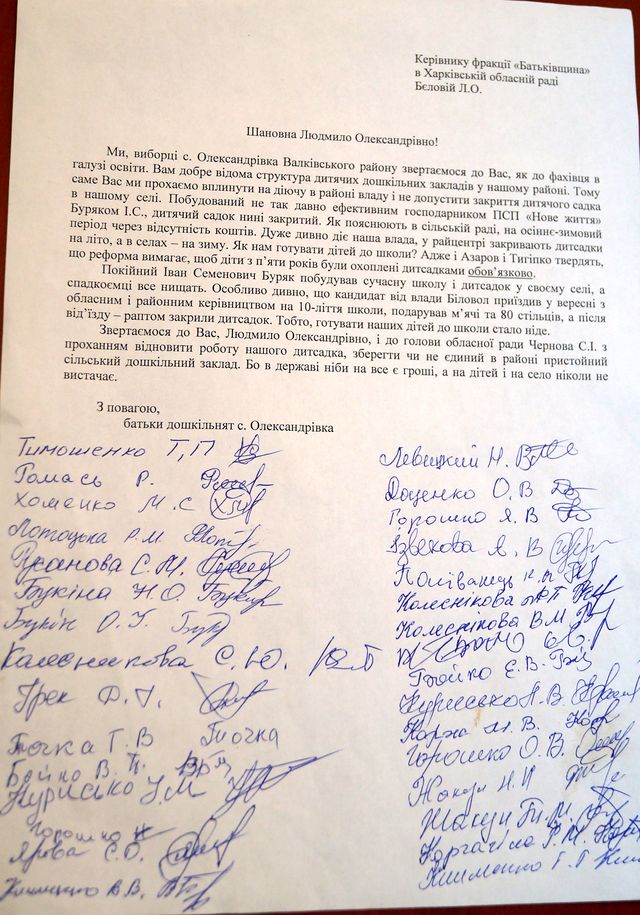 В селе Александровка Валковского района Харьковщины власть решила закрыть детский садик. Об этом стало известно из письма местных жителей на имя депутата Харьковского облсовета, экс-заместителя губернатора области Людмилы Беловой, которая с 2005 по 2010 года курировала вопросы образования.