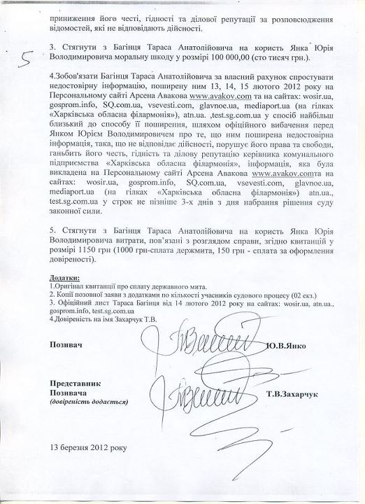 В результате, как сообщает Тарас Багинец в сети Facebook, директор филармонии, депутат облсовета от ПР Юрий Янко 13 марта 2012 года подал во Фрунзенский районный суд Харькова исковое заявление о защите чести, достоинства и деловой репутации, а также возмещения морального вреда, который сам Янко оценивает в 100 тысяч грн.