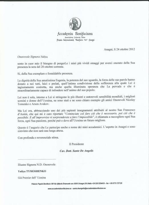 Председатель «Бонифицианской академии» Кавалер Доктор Санте де Анджелис направил лидеру украинской оппозиции Юлии Тимошенко благодарственное письмо.