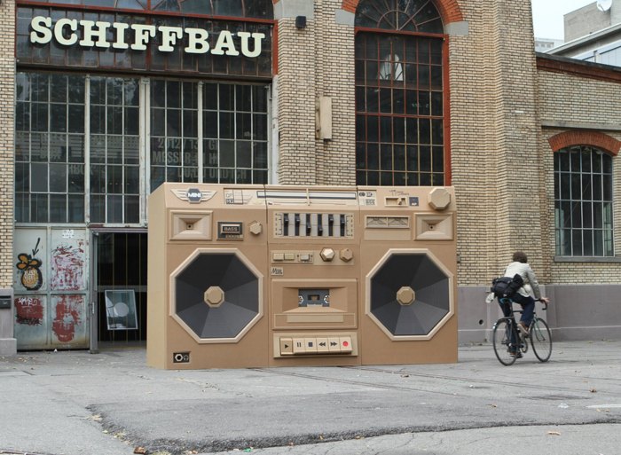 Картонные скульптуры охватывают различные темы, от тяжелого пулемета до устаревшей электроники из 80-х. Инсталляции на берлинских тротуарах демонстрируют удивленным прохожим камин с бумажным пламенем внутри, огромный «бумбокс» и камеру наружного наблюдения, на первый взгляд, в полной рабочей готовности.