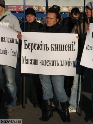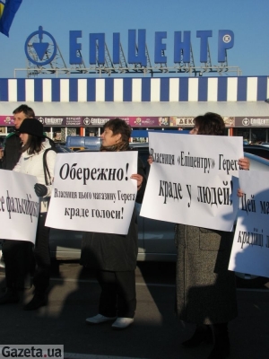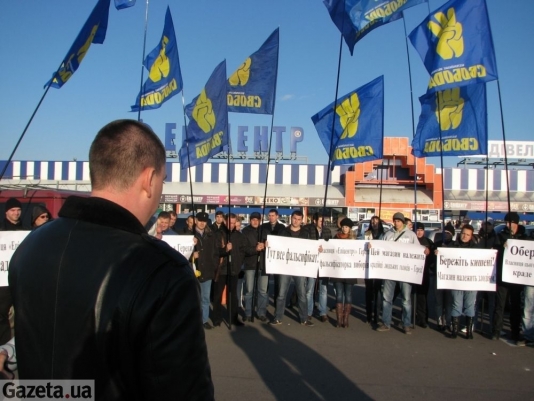 Около полусотни "свободовцев" провели пикетирование супермаркета строительных материалов и техники "Эпицентр" во Львове из-за подтасовки голосов Галиной Герегой в Киеве, пишет Gazeta.ua