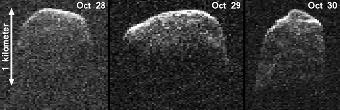Снимки представляют собой множества объединенных изображений, сделанных с 28 по 30 октября с помощью 70-метрового радара системы Deep Space Network, расположенного в калифорнийском Голдстоуне. На них запечатлен астероид 2007 PA8 (первое число в этом индексе – год открытия), находящийся примерно в 9 миллионах километров от Земли. 5 октября это расстояние сократилось до 6,5 миллиона километров.