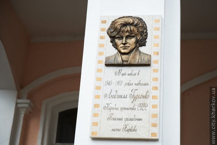 Мемориальная доска сделана из мрамора. На ней - бронзовый барельеф актрисы и подпись: "В этой школе в 1943-1953 годах училась Людмила Гурченко, народная артистка СССР, почетный гражданин Харькова".
