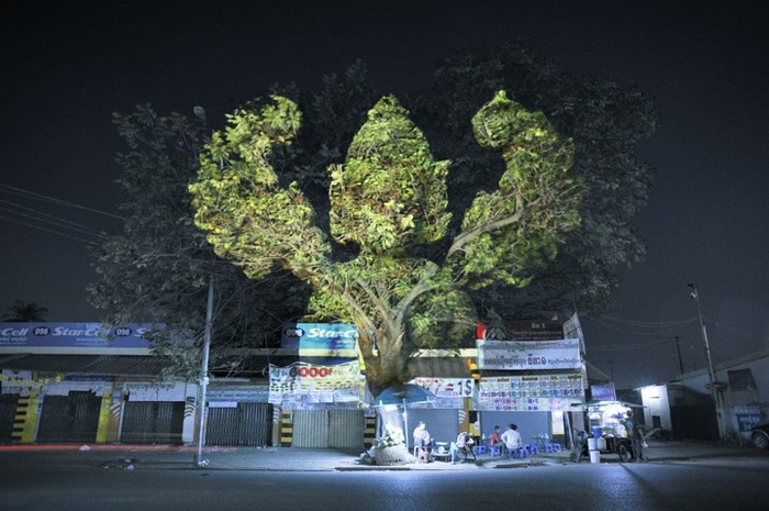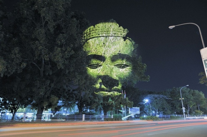 Французский фотограф Clement Briend использует образы древних камбоджийских скульптур для придания обычным объектам большей красочности и эффектности. Проектируя 3D-изображения на деревья и здания на городских улицах, Briend старается персонифицировать окружающий его мир.