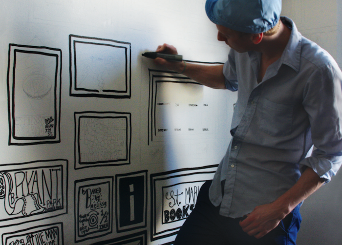 Вооружившись лишь маркерами и густой черной краской, дизайнер Timothy Goodman превратил пустые белые стены комнаты Ace Hotel в Нью-Йорке в выставку собственных работ, отдавая дань Большому Яблоку.