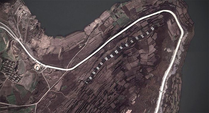 «Да здравствует товарищ Ким Чен Ын, наше сияющее солнце!», — гласит надпись. Размер каждой буквы – 15–20 метров (пяти-семиэтажный дом).