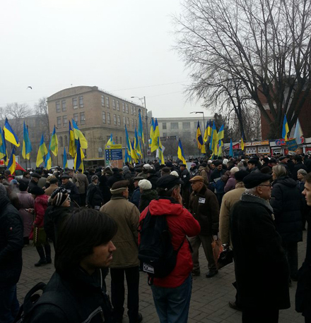 На данное время среди них нет представителей политических сил. Также нет никаких политических знамен. Участники акции держат в руках украинские национальные флаги с красными лентами. Также люди несут цветы с траурными лентами, траурные венки, пшеничные колосья.