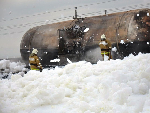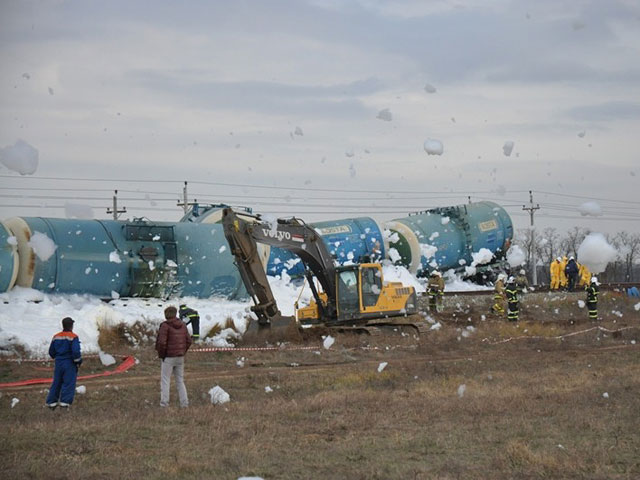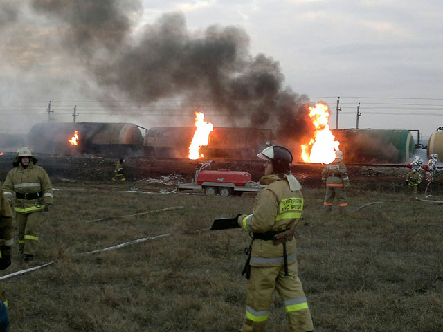 Напомним, инцидент произошел рано утром в Темрюксом районе Кубани. При сходе вагонов с рельсов возникла искра, которая и привела к возгоранию. По уточненным данным, из 69 груженых мазутом вагонов с рельсов сошли 17, четыре из них загорелись.