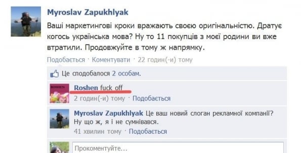 Украинец Мирослав Запухляк оставил на странице корпорации "Roshen" в социальной сети "Фейсбук" такую запись: