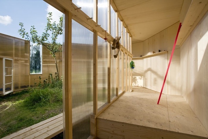 Зеркальщики конечно постарались на славу. Здание снаружи полностью выложено зеркалами, образуя сплошные зеркальные стены. Даже двери, которые ведут внутрь помещения, замаскированы под зеркала. Так что еще придется поискать вход, прежде чем попасть внутрь. Внутренний интерьер выполнен из дерева и дополнен также деревянными элементами – стол, стулья, полки, вешалка. Дом имеет кольцеобразную форму, так что внутри образует небольшой дворик. В этом внутреннем саду стоит обеденный стол, который можно разглядеть через полупрозрачный фасад здания.