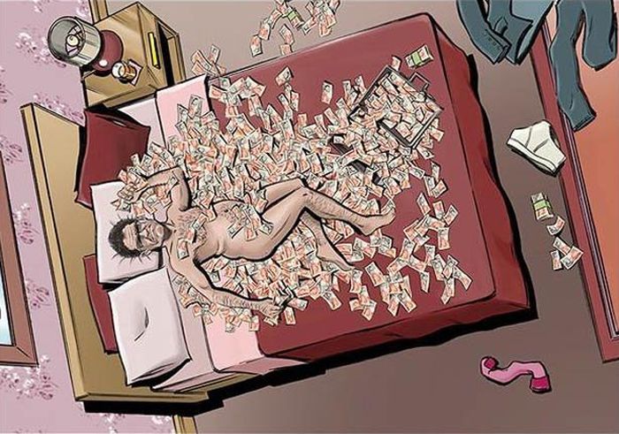 Отметим, что итальянский наставник сборной России по футболу изображен голым на двуспальной кровати, купающимся в деньгах из открытого кейса.