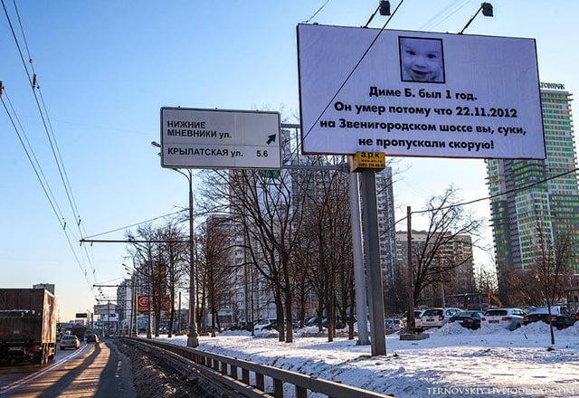 На плакате изображена фотография маленького мальчика, а подпись гласит: "Диме Б. был один год. Он умер потому что 22.11.2012 на Звенигородском шоссе вы, с**и, не пропускали скорую!".