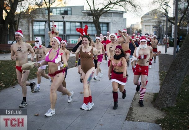 На эти выходные группа людей, одетых в шляпы Санта Клаусов и в купальные костюмы устроили веселый забег по улицам Будапешта.