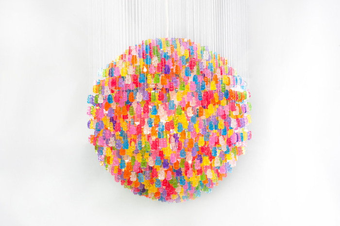 Американский художник Kevin Champeny по заказу кондитерской компании Jellio создал необычный дизайнерский объект - подвесной светильник в виде шара, сделанный из 3000 мишек.