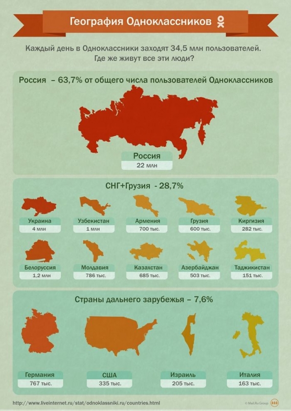 Российская соцсеть "Одноклассники" выпустила инфографику, в которой показывает географическое распределении своих пользователей по странам пребывания.